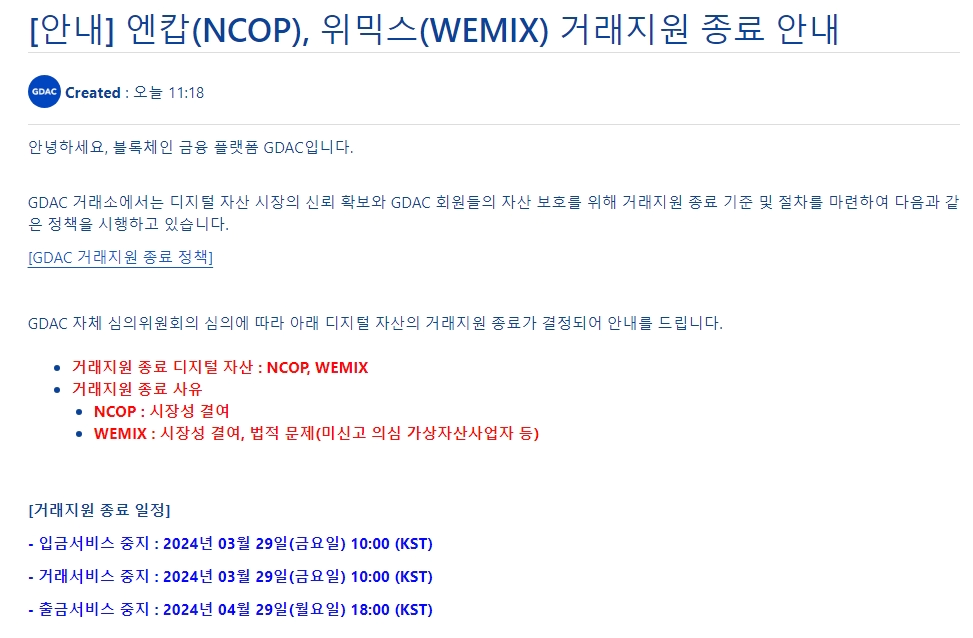 한편 위믹스의 입금 및 거래는 지닥에서 29일에 종료되며, 출금은 다음 달 29일 오후 6시에 중단될 예정입니다.