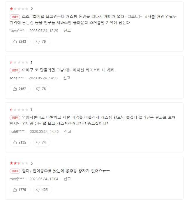 한 포털 사이트 평점란은 1.96(10점 만점)을 기록하고 있다. 한줄평을 살펴보면 흑인 인어공주에 대한 반감부터 할리 베일리의 외모 비평까지 신랄하게 이뤄지고 있으며 이 과정에서 '탄 생선', '흑어공주', '아귀' 등 과격한 표현까지 등장하고 있는 상황입니다.