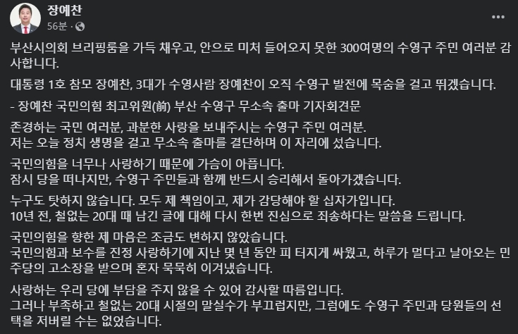 막말로 부산 수영구 공천을 취소당한 장예찬 후보가 결국 국민의힘을 탈당하고 무소속 출마를 선언해 화제가 되고 있습니다.