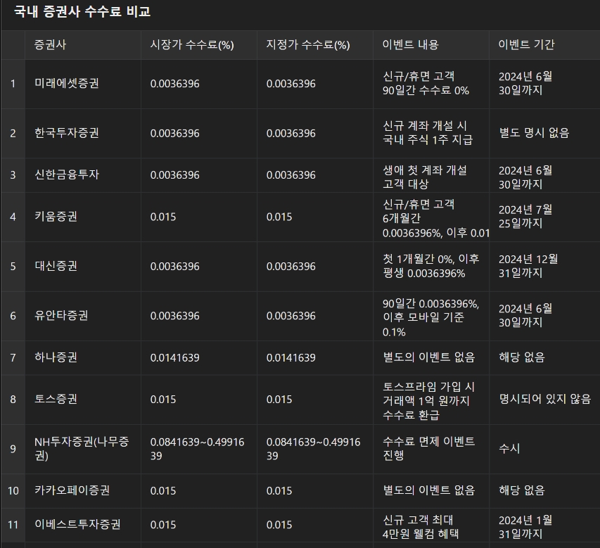 아래는 2024년 주요 증권사의 시장가 및 지정가 수수료를 정리한 표입니다.