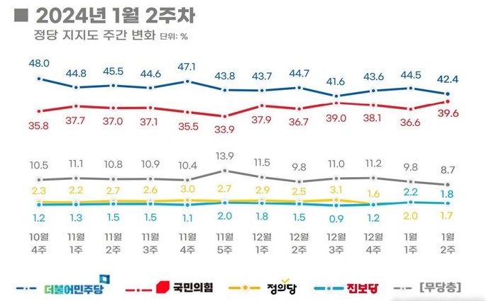 한편 진보당의 정당 지지율은 최근 1월 2주차 지지율 조사를 살펴보면 1.8%로 정의당을 앞서는 모습을 보여주고 있어 화재가 되고 있습니다.